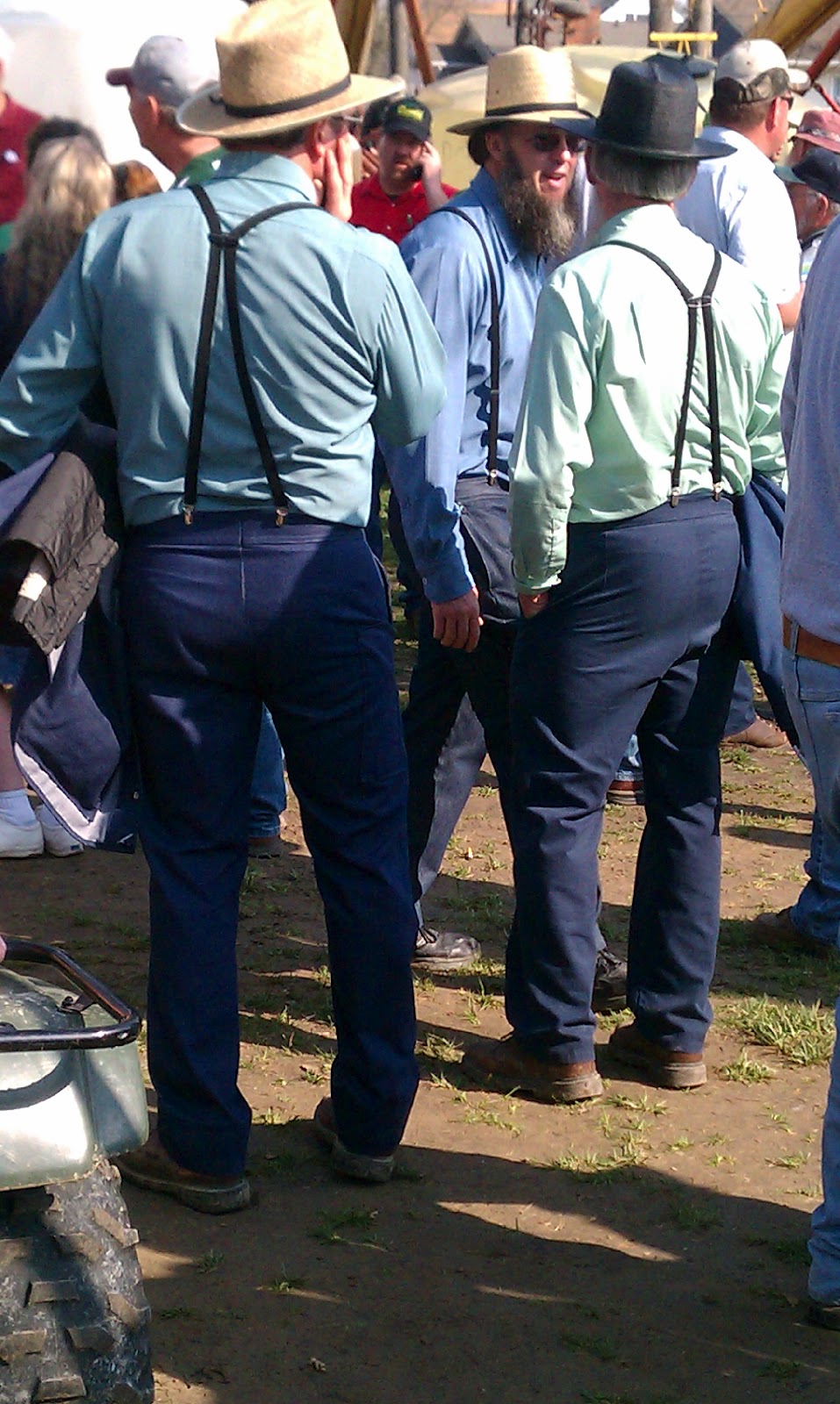 As I start to look around, I realize {quickly} this really is a farm auction. Wonderful old tractors, hay wagons, huge Combines, and more. I then realized, I don't belong here! As I look around further, I see lots of men in overalls and then these gentleman.....
